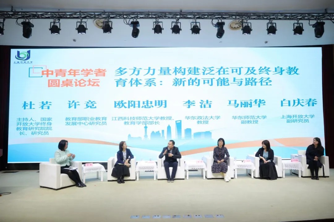 由国家开放大学终身教育研究院院长杜若研究员主持,教育部职业教育发展中心许竞研究员,江西科技师范大学教育学部主任、教育学院院长欧阳忠明教授,华东政法大学李洁教授,华东师范大学马丽华副教授,上海开放大学白庆春副研究员参与的“多路径构建泛在可及终身教育体系:新的可能与路径”的中青年学者圆桌论坛,从多方协同、制度建设、数智赋能、国际比较等视角畅谈了构建泛在可及终身教育体系的愿景与建构路径。