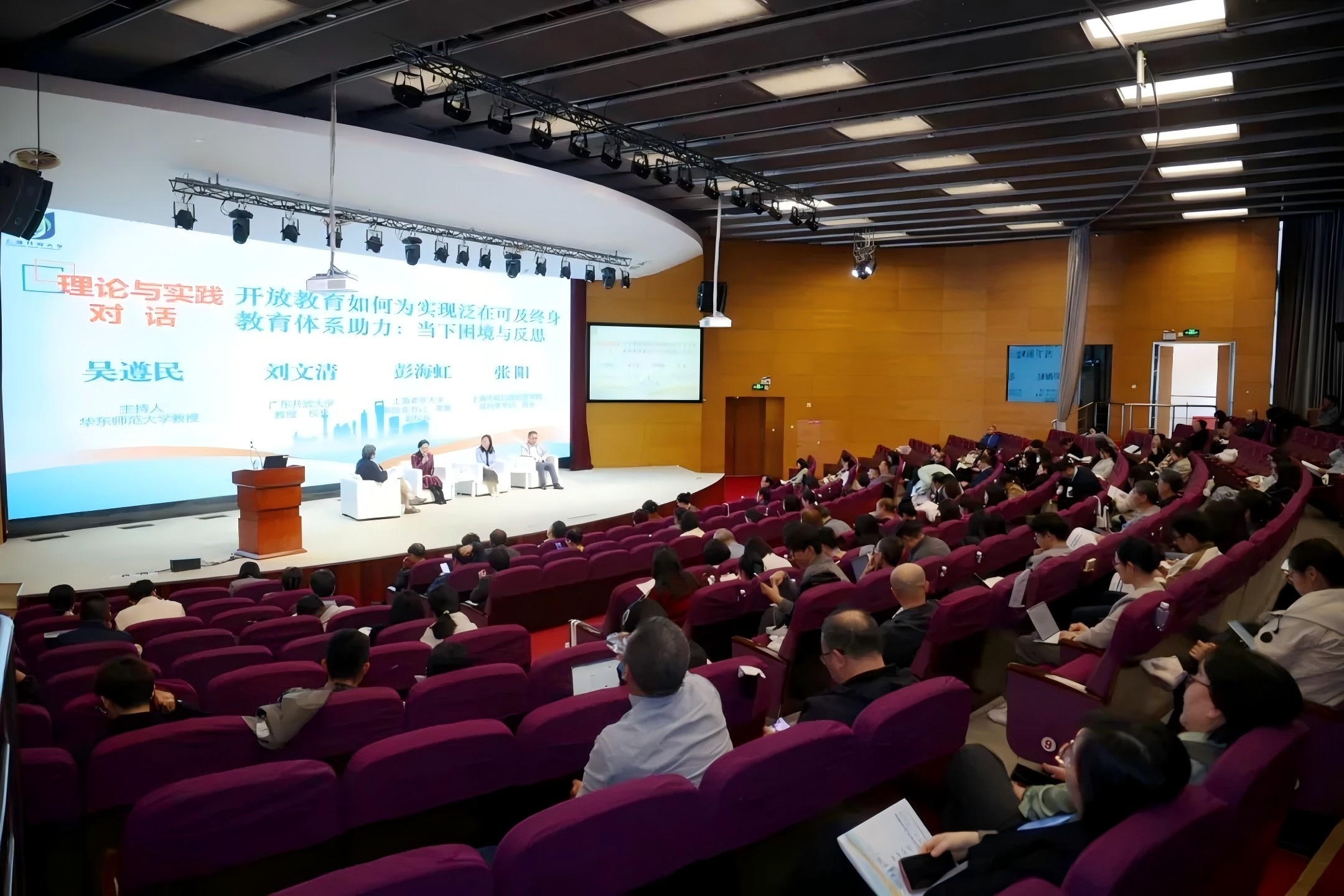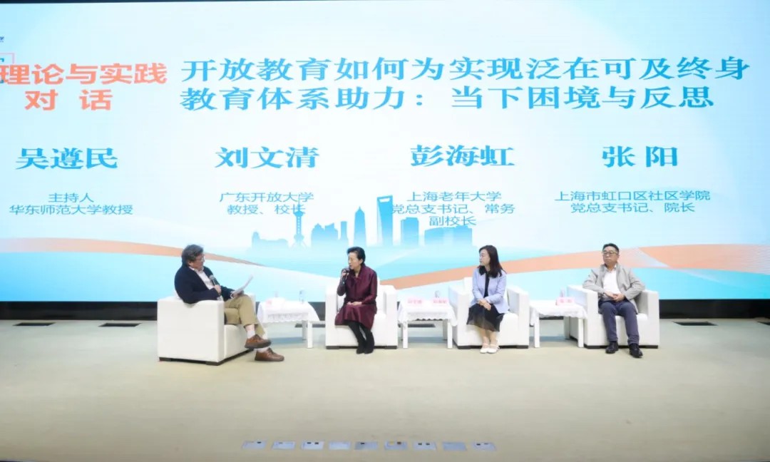 由华东师范大学吴遵民教授主持,广东开放大学校长刘文清教授,上海老年大学党总支书记、常务副校长彭海虹,上海市虹口区社区学院党总支书记、院长张阳参与的理论与实践对话,围绕“开放教育如何为实现泛在可及终身教育体系助力:当下困境与反思”论题,深入剖析了构建泛在可及终身教育体系理论与实践之间的问题与解决路径。