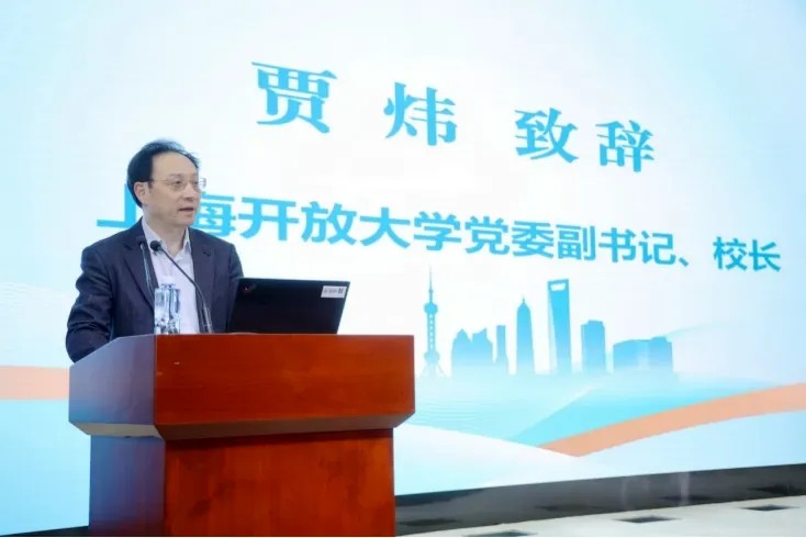 ▲上海开放大学党委副书记、校长贾炜致辞