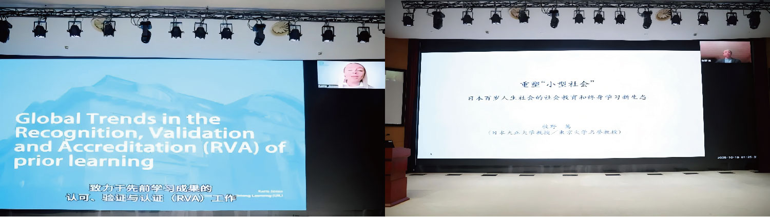 ▲联合国教科文组织终身学习研究所顾问凯蒂·琼斯、日本大正大学牧野笃教授以视频形式作了主旨演讲